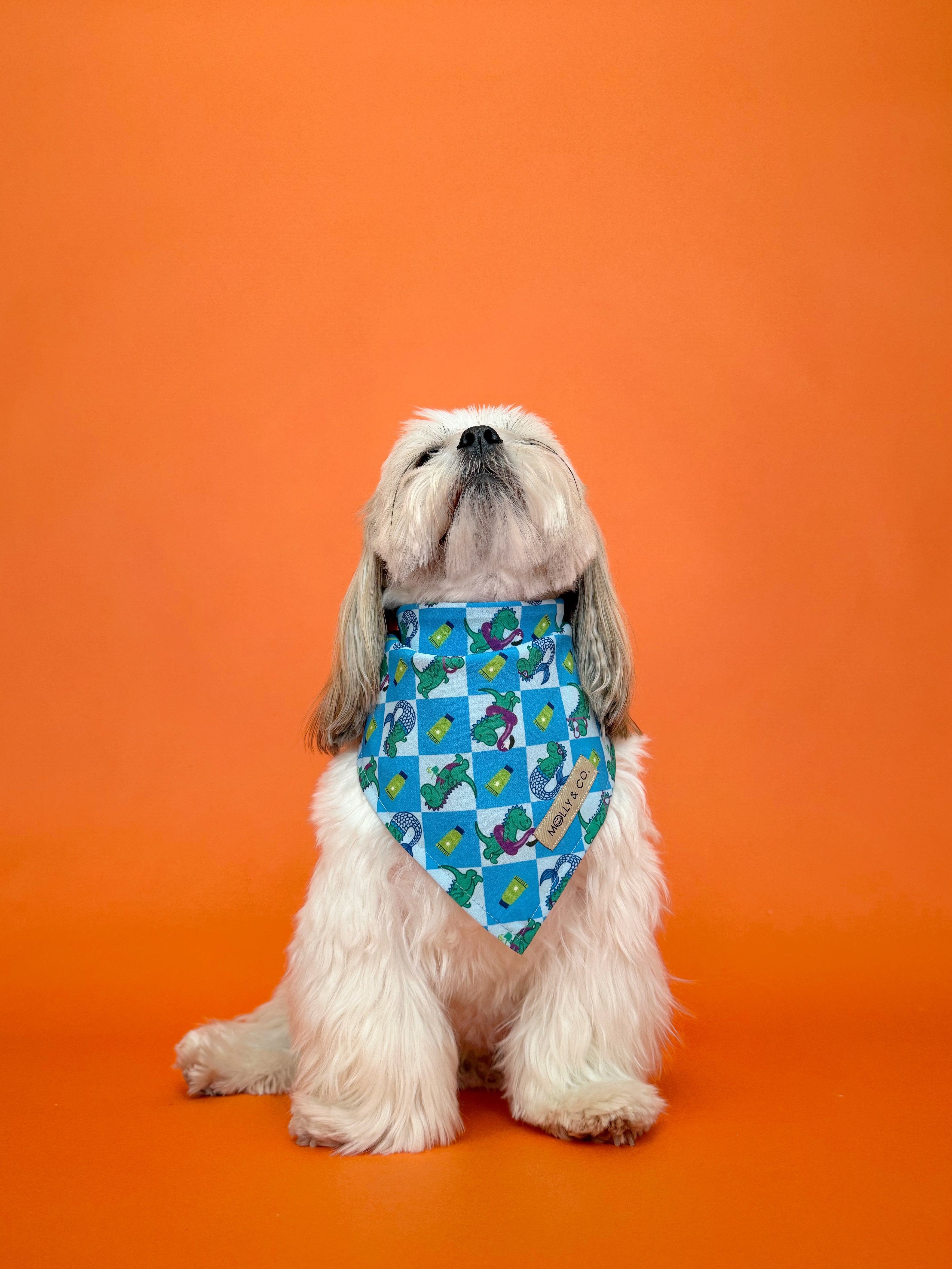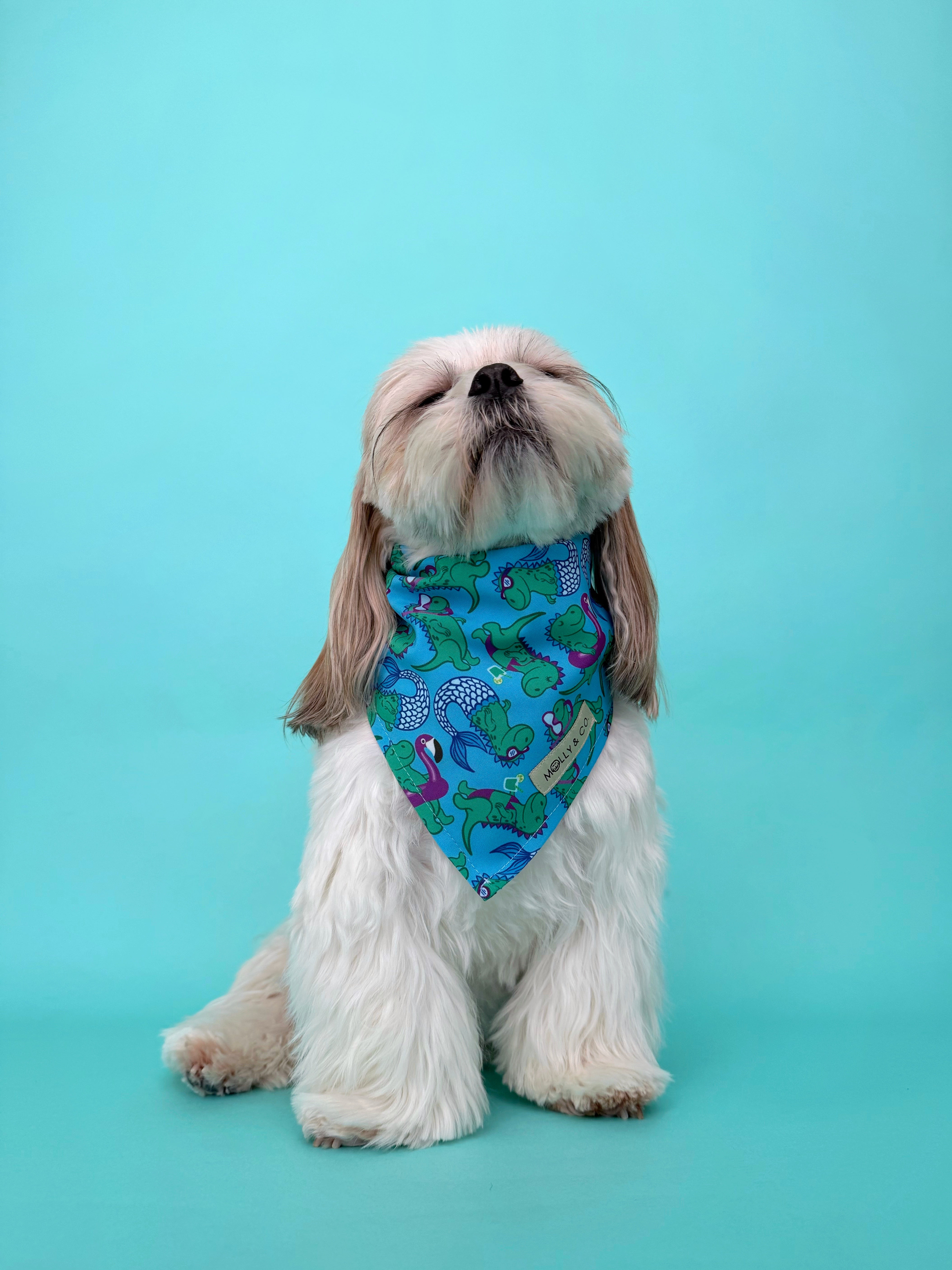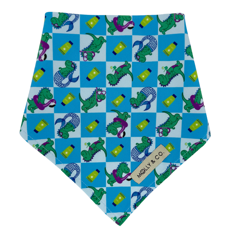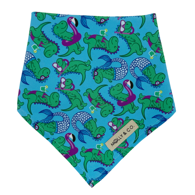 Because even dinos need SPF. The Rex in Paradise Reversible Dog Bandana brings the prehistoric party to the beach - complete with mermaid tails, sunblock bottles, and a whole lot of personality. With two playful prints in one, this reversible design gives your pup double the fun in one easy-to-wear accessory.