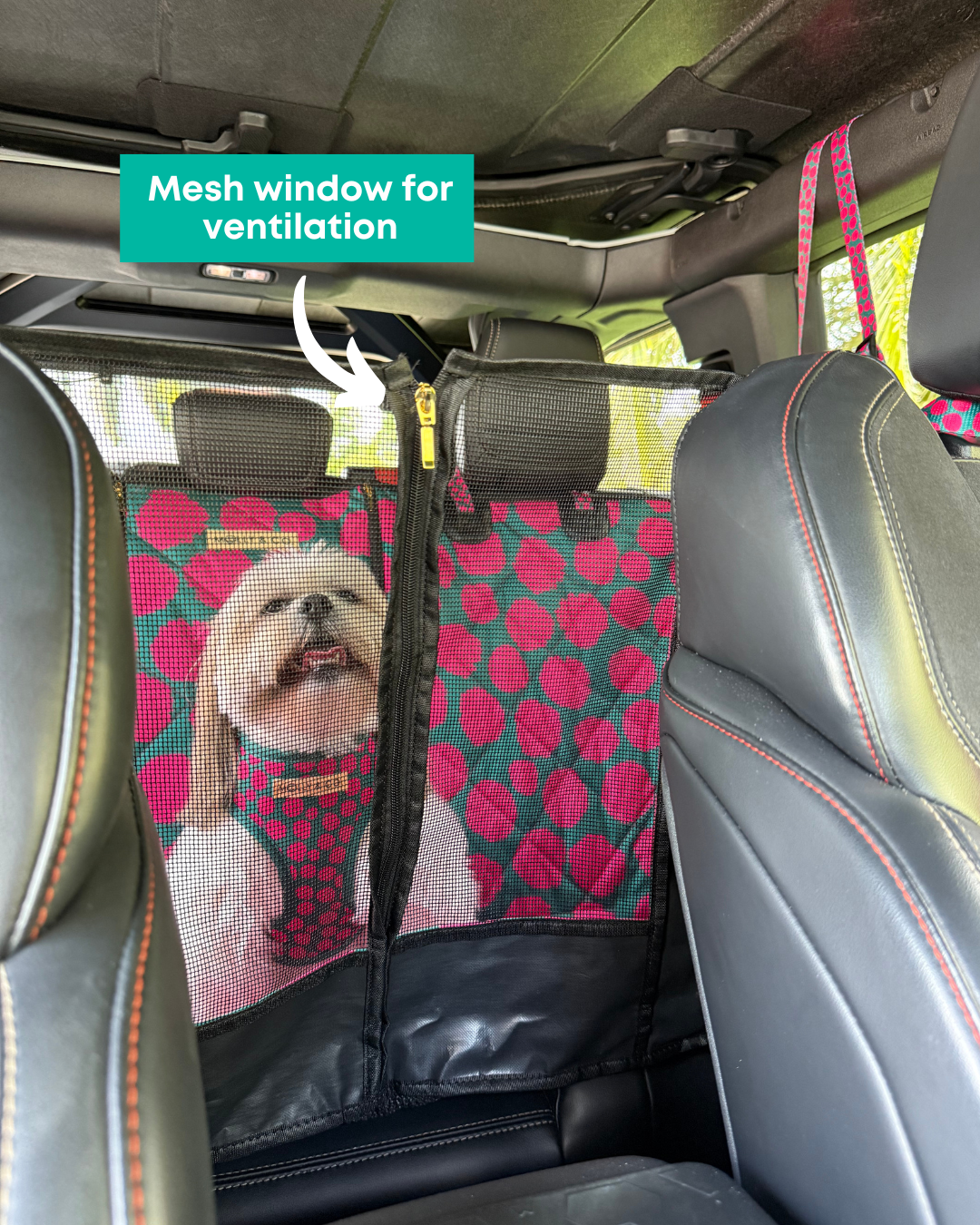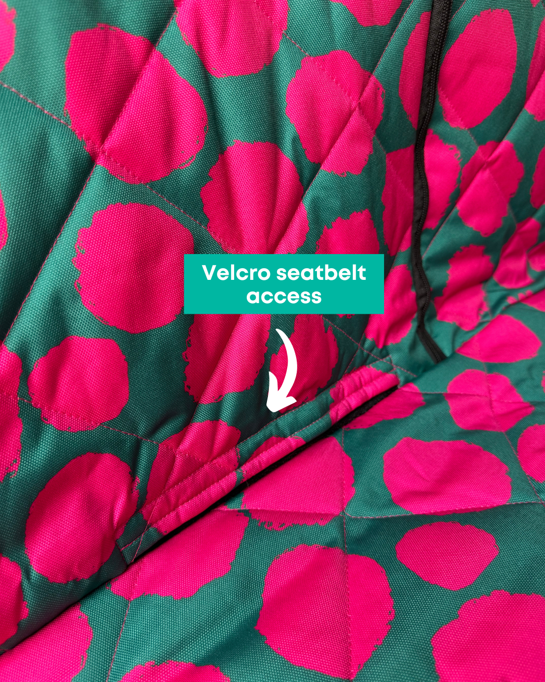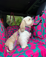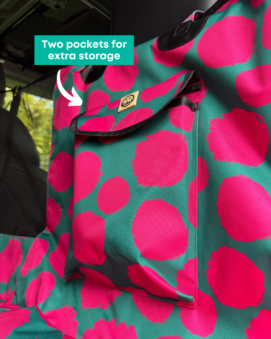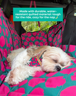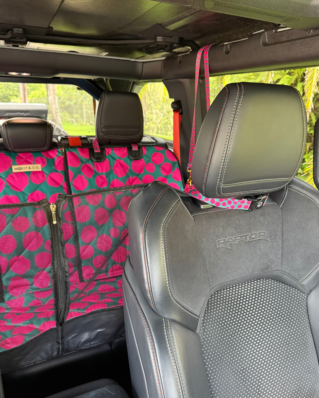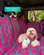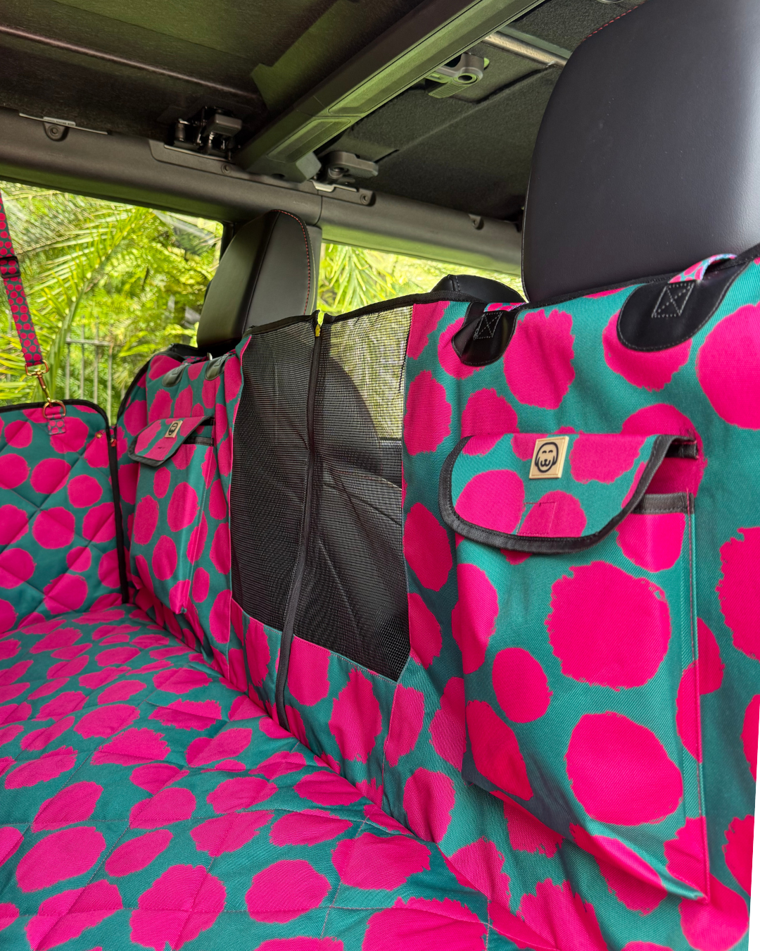 Designed for pups with main character energy, this car cover turns every ride into a runway. With its bold fuchsia and emerald green pattern, Polka Dogz brings a splash of personality to your backseat while keeping things clean and protected.