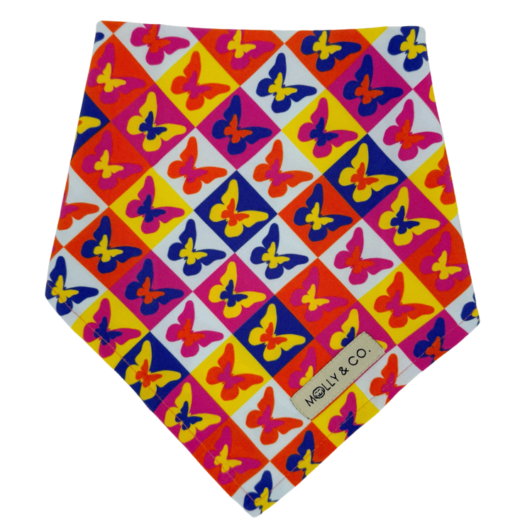 Add an extra dose of style and cuteness to your dog with our Mariposa bandana. This bandana features a Molly & Co. hand drawn original design.