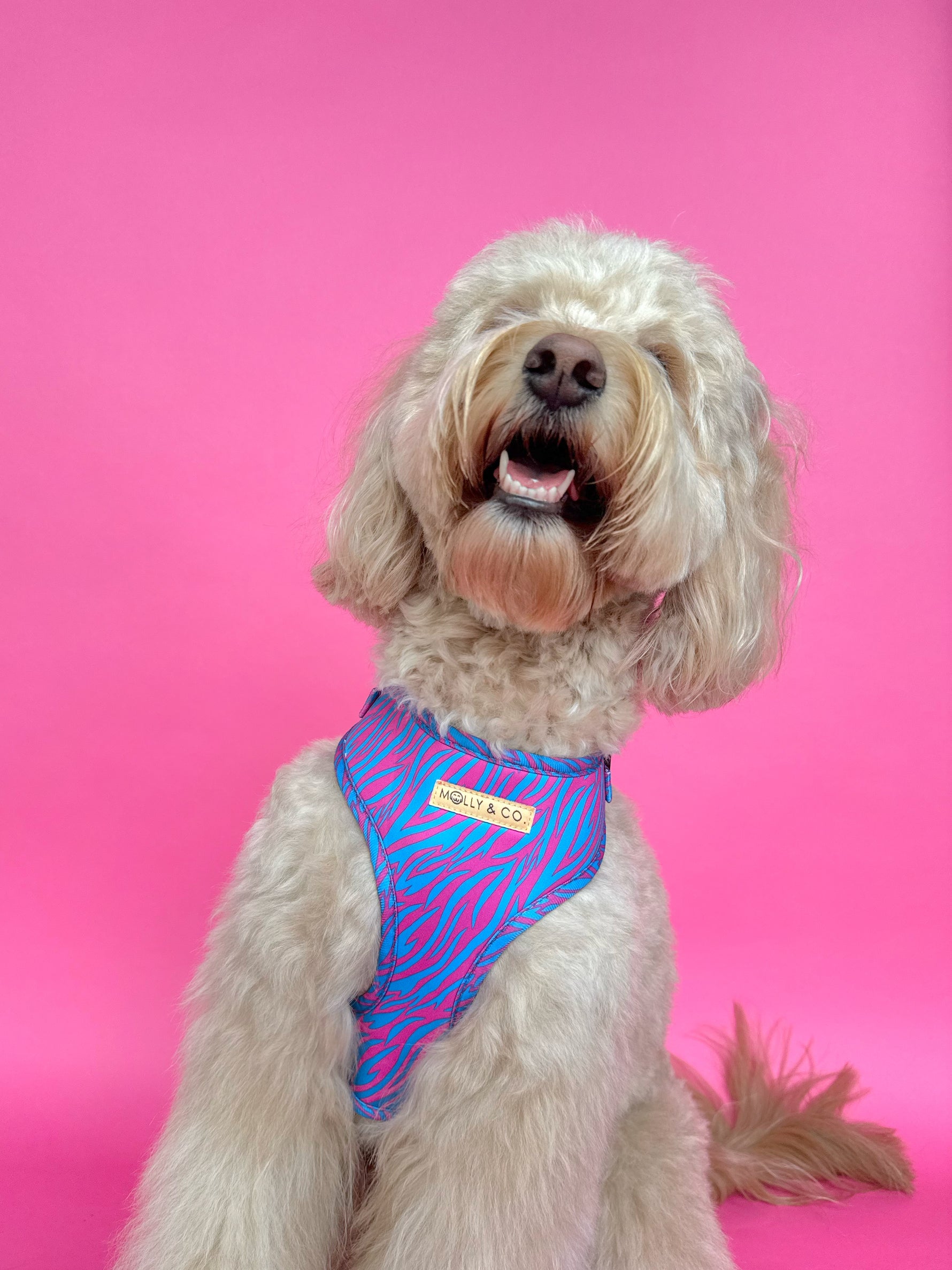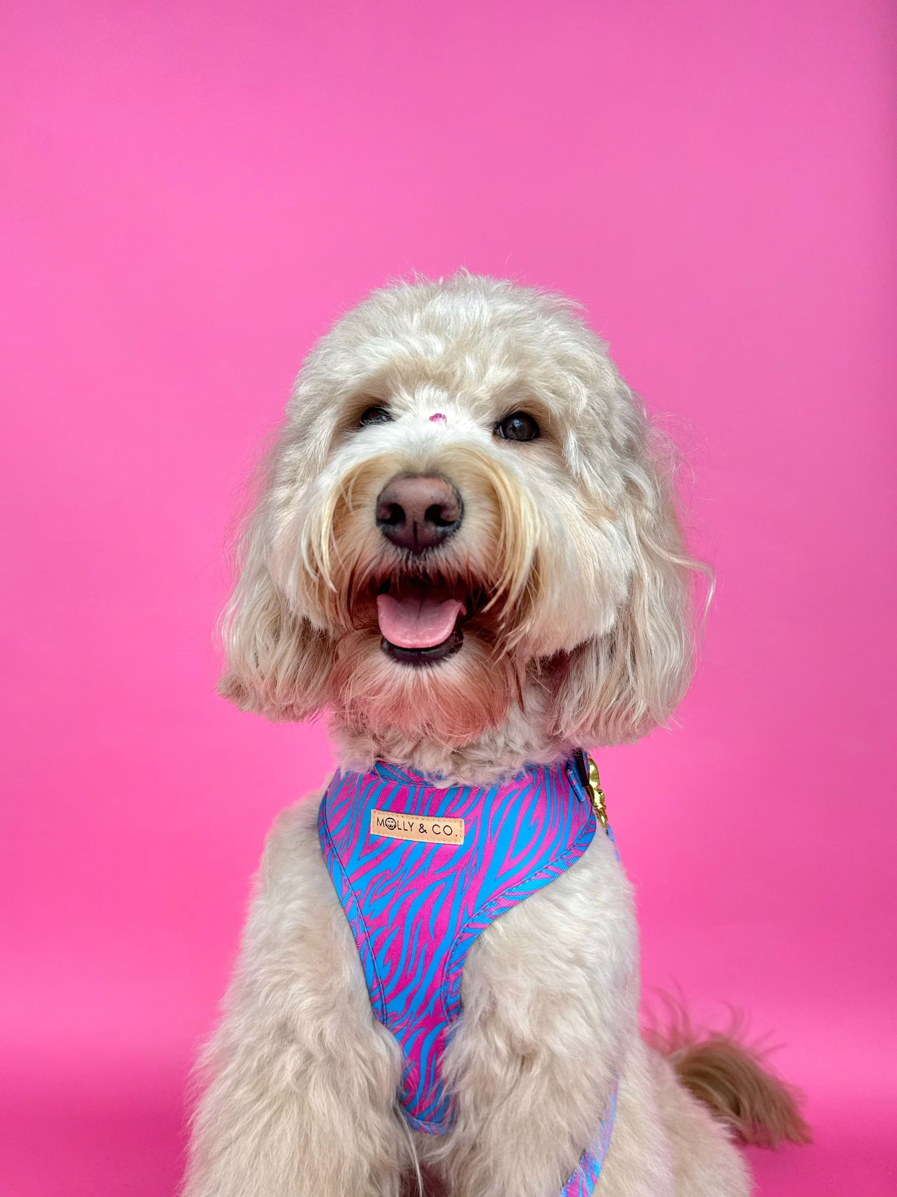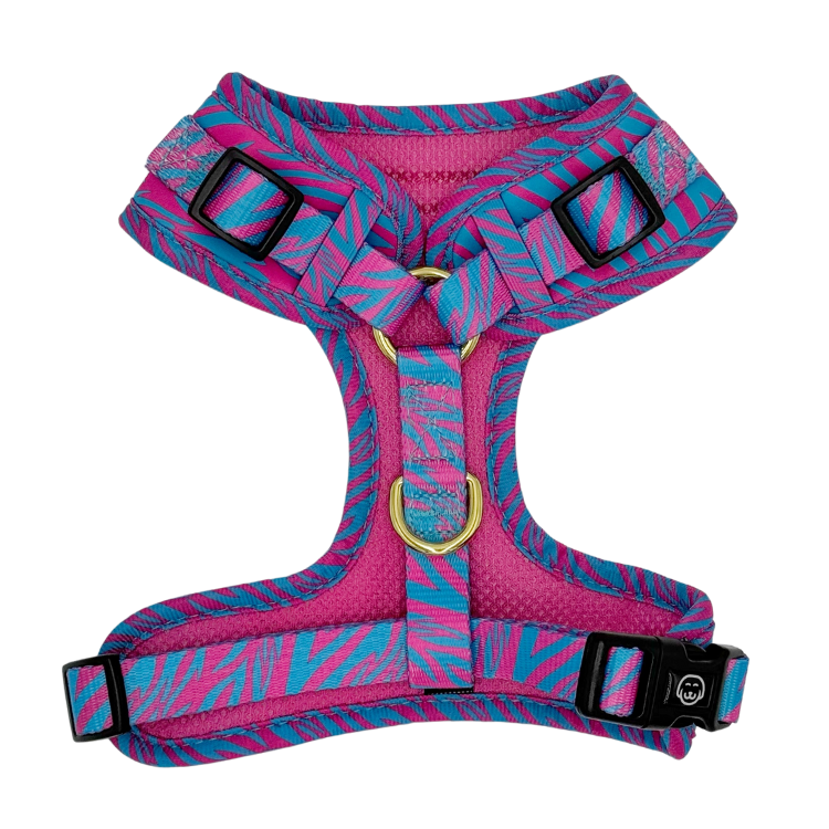 Where playful style meets functional design, the Malibu Doll Adjustable Harness is a must-have for the trendsetting pup. Featuring a striking pink and aqua blue tiger print, this harness is perfect for the pup that knows style. Designed with both comfort and style in mind, your dog will turn heads on every walk.