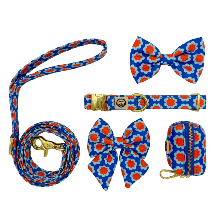 Step up your pup’s style game with our Sorrento Deluxe Bundle! Featuring vibrant blue and orange geometric florals, this matching set includes all the essentials for a polished, playful look — a collar, leash, poop bag holder, and bowtie. Designed for everyday adventures and extra-special outings, it’s the perfect bundle for pups who were born to stand out.