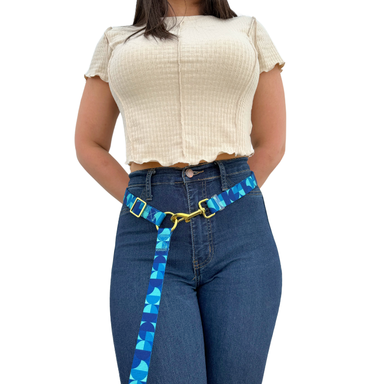 Stay hands-free and effortlessly stylish with our Milos Hands-Free Dog Leash! Designed in ocean-inspired shades of blue with a bold geometric pattern, this leash can be worn crossbody, around the waist, or handheld — perfect for busy mornings, seaside strolls, or pups who like to walk with flair.