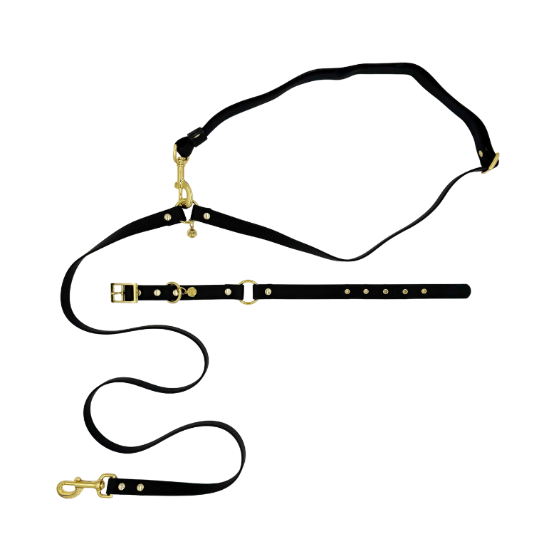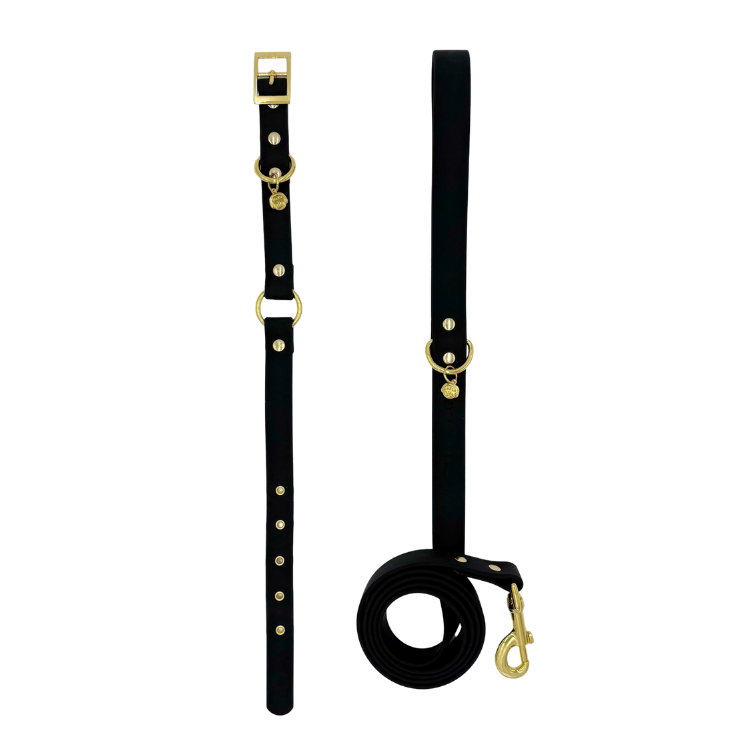 Timeless. Sleek. Unstoppable. The Midnight Splashproof Walking Bundle pairs our black splashproof collar with your choice of matching leash for a walk set that’s equal parts style and utility. Built to handle rainy days and muddy paws while keeping your pup polished and put-together.