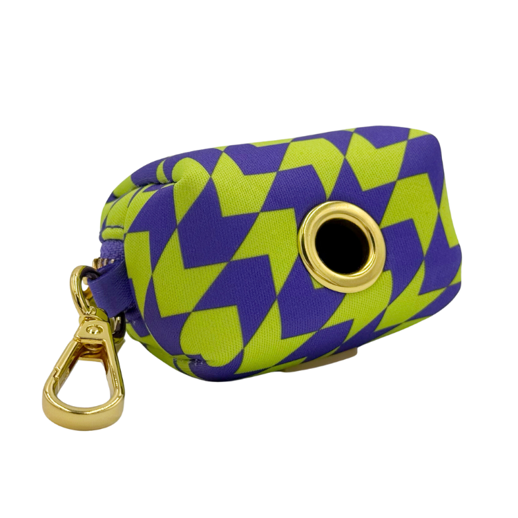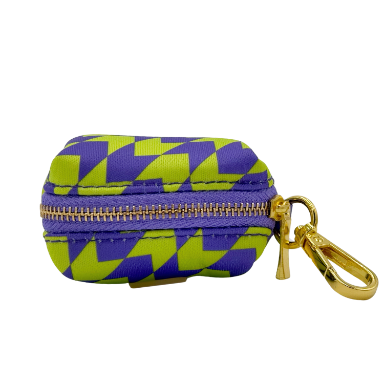 Add some retro flair to your walks with our Fetch Master Poop Bag Holder! Featuring a lively lime green and purple geometric pattern, this 90s-inspired accessory makes even the most practical tasks a little more fun and stylish.