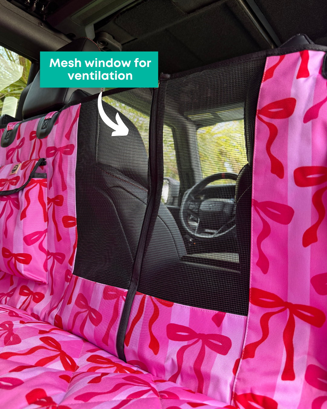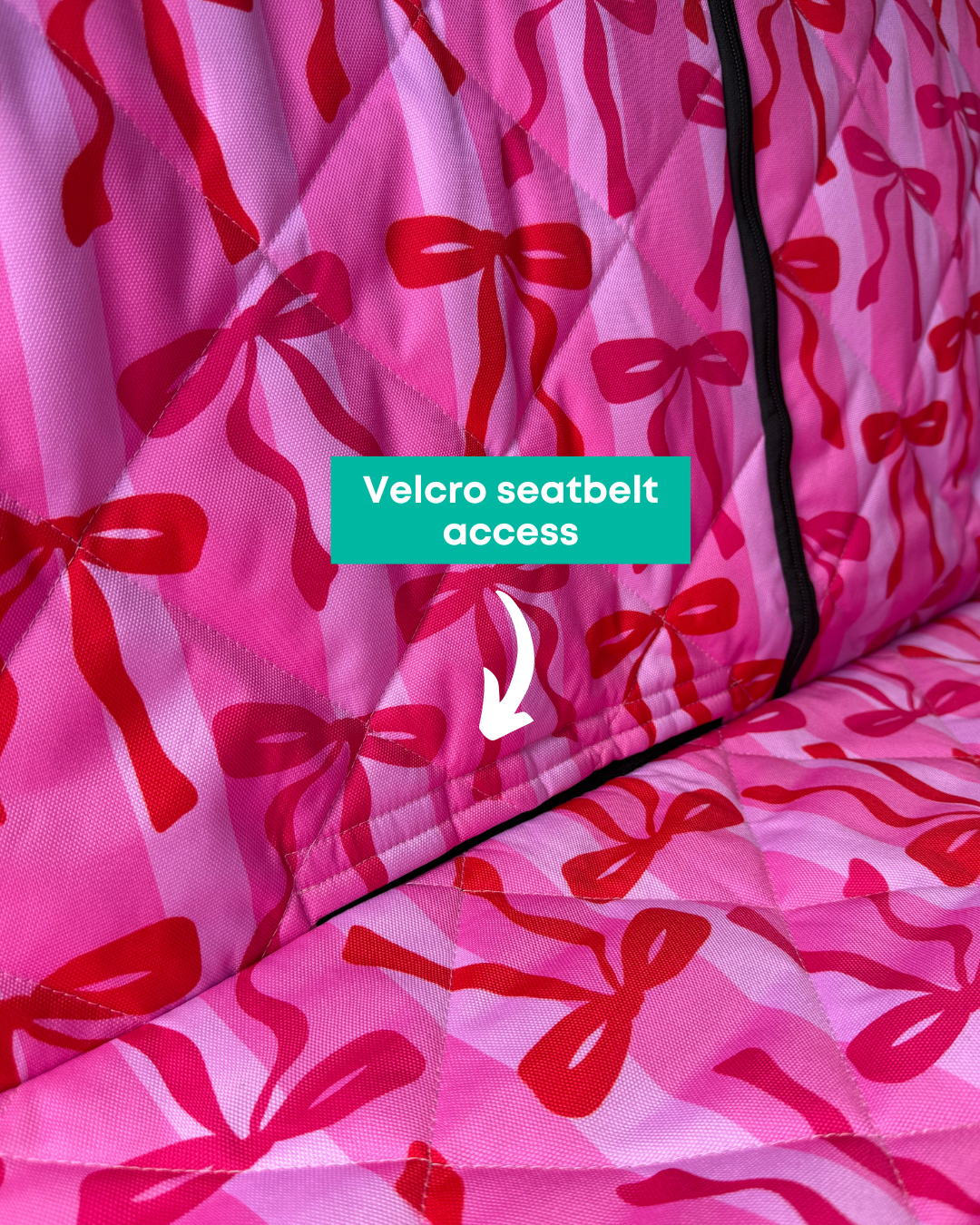 This isn't just any car ride, it’s a runway moment. Featuring our iconic Coquette print, this seat cover brings soft charm and serious style to your backseat, all while keeping it protected from fur, dirt, and daily messes.