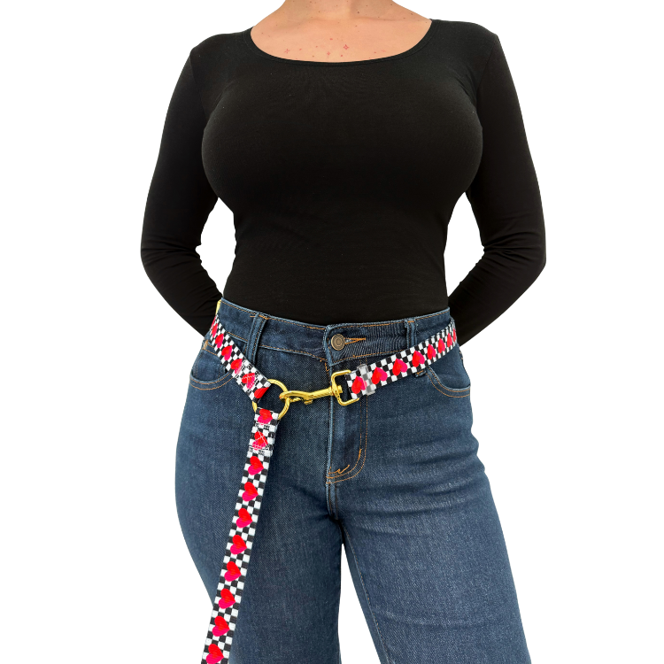 The Lovebug Handsfree Dog Leash is made for pups who go everywhere with you. With its black and white checkered print dotted with pink hearts, it keeps things cute while letting you stay comfortably hands-free on coffee runs, errands, and long walks.