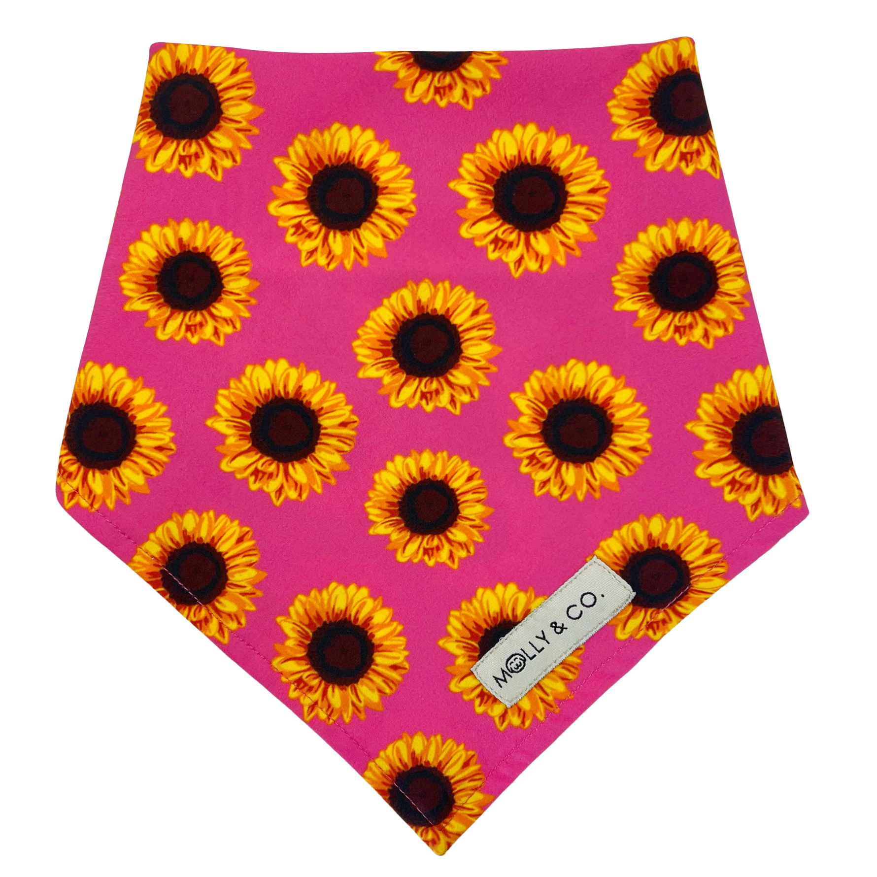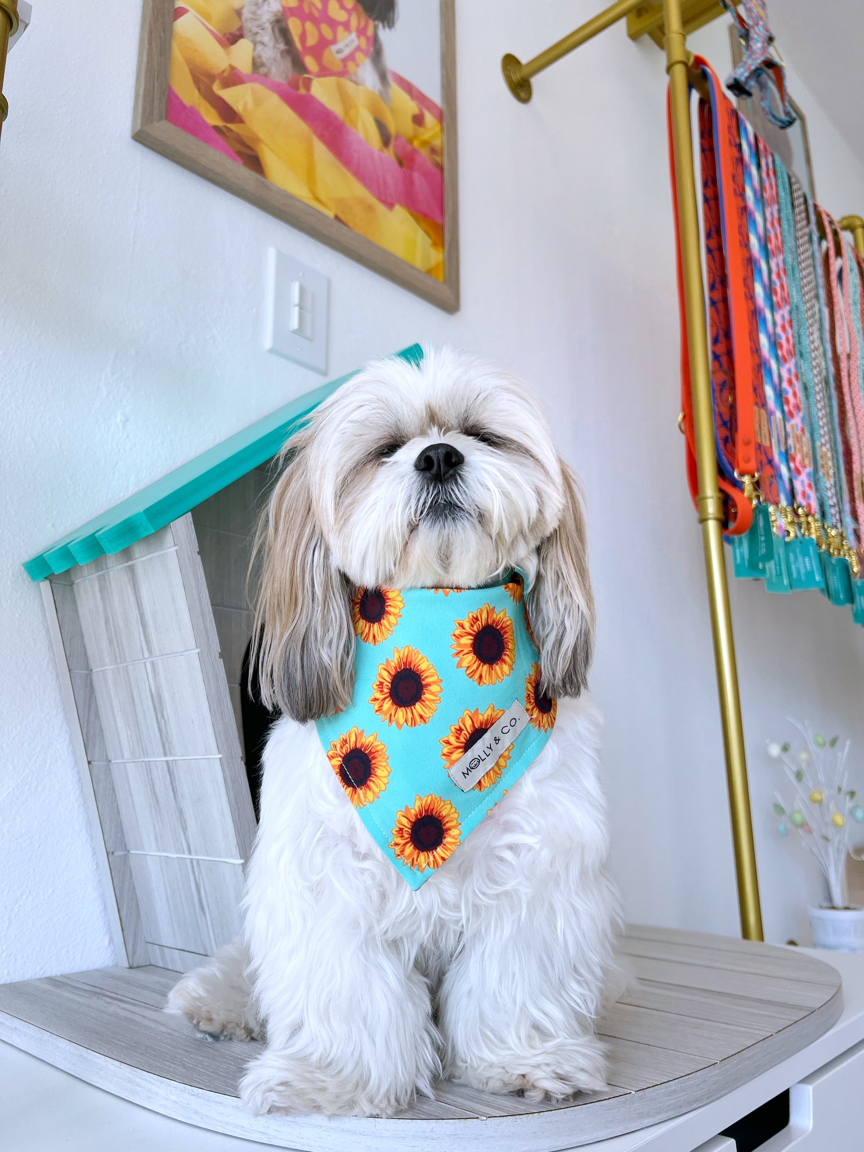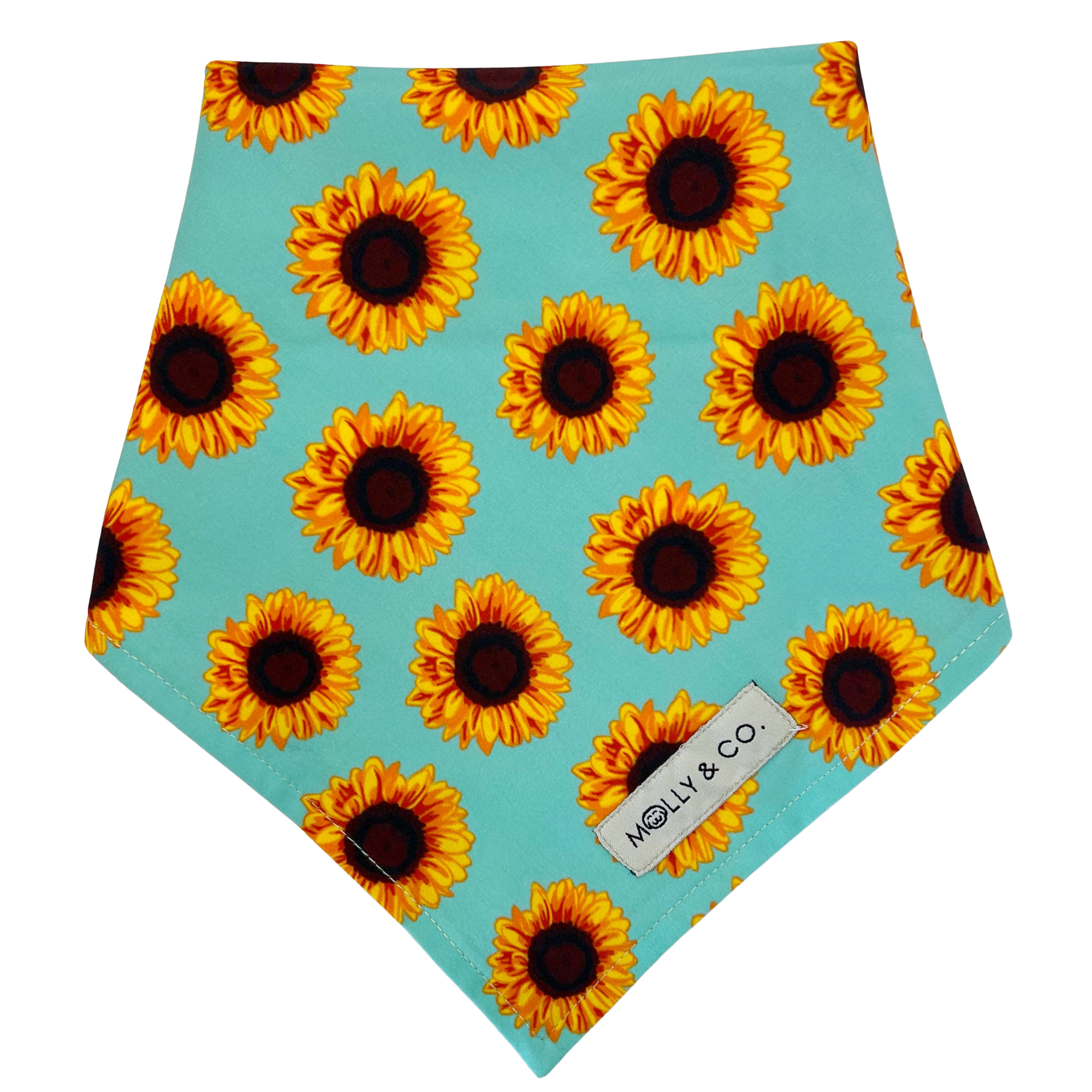 Your pup will look ready for spring with our sunflower reversible bandana. This bandana features a Molly & Co. hand drawn original design.
