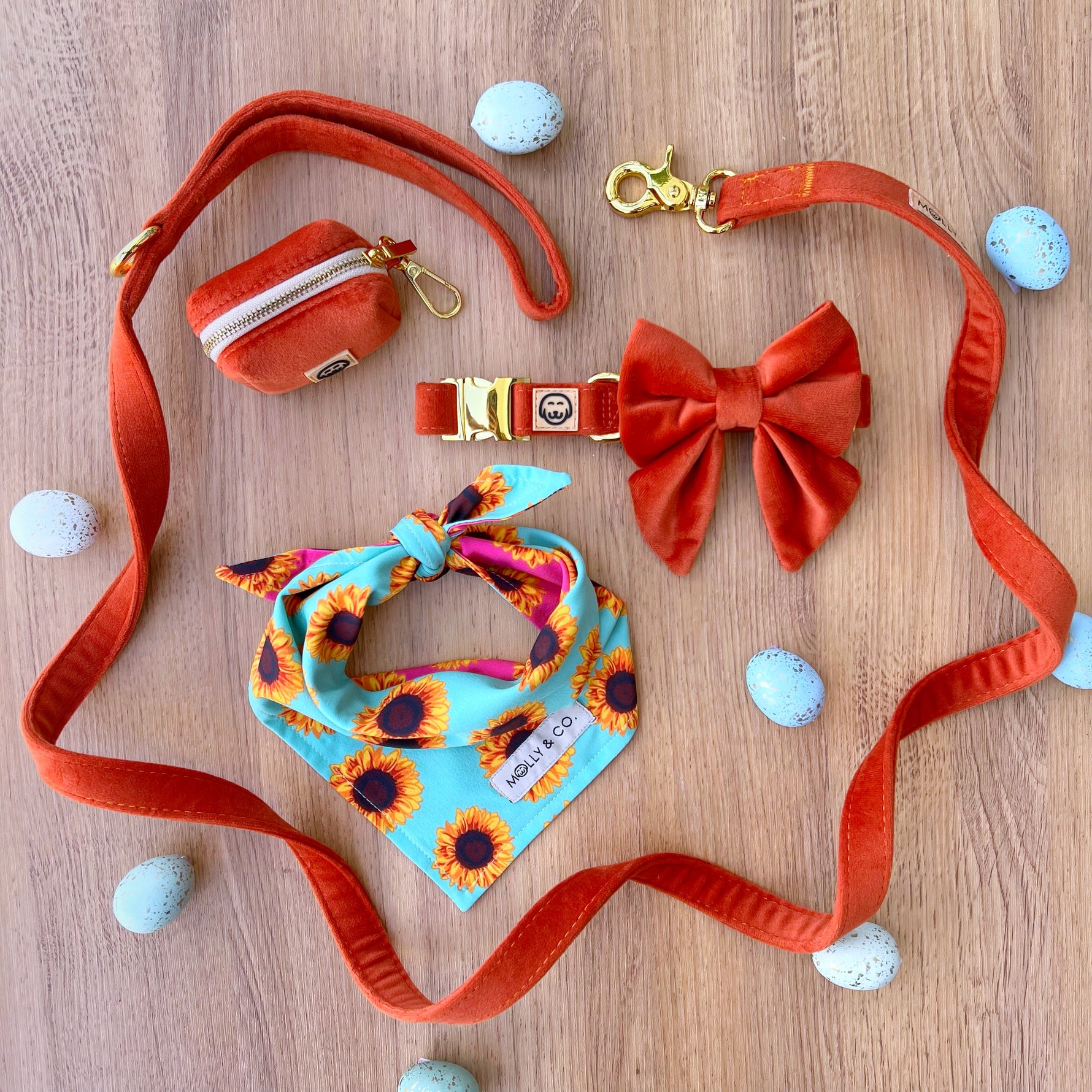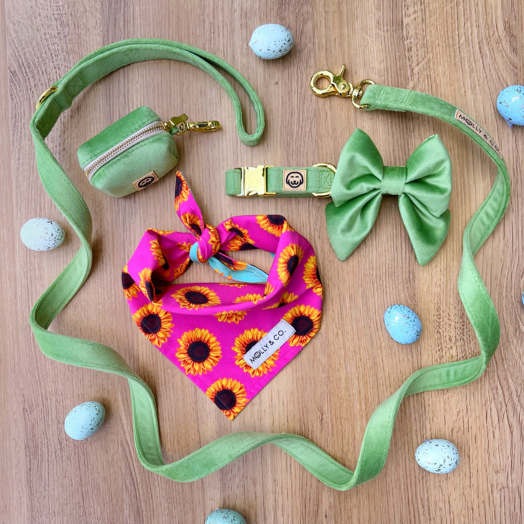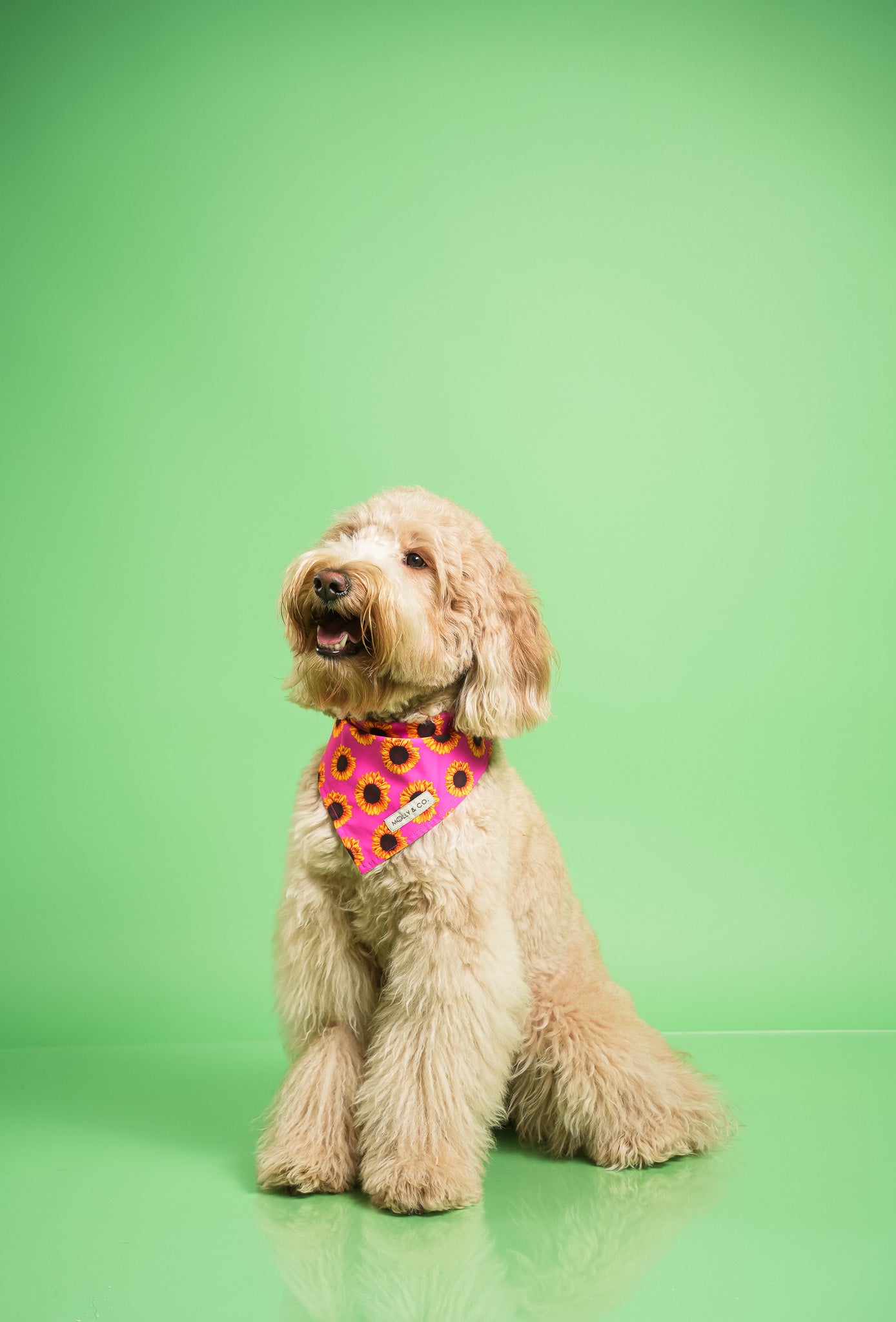 Your pup will look ready for spring with our sunflower reversible bandana. This bandana features a Molly & Co. hand drawn original design.